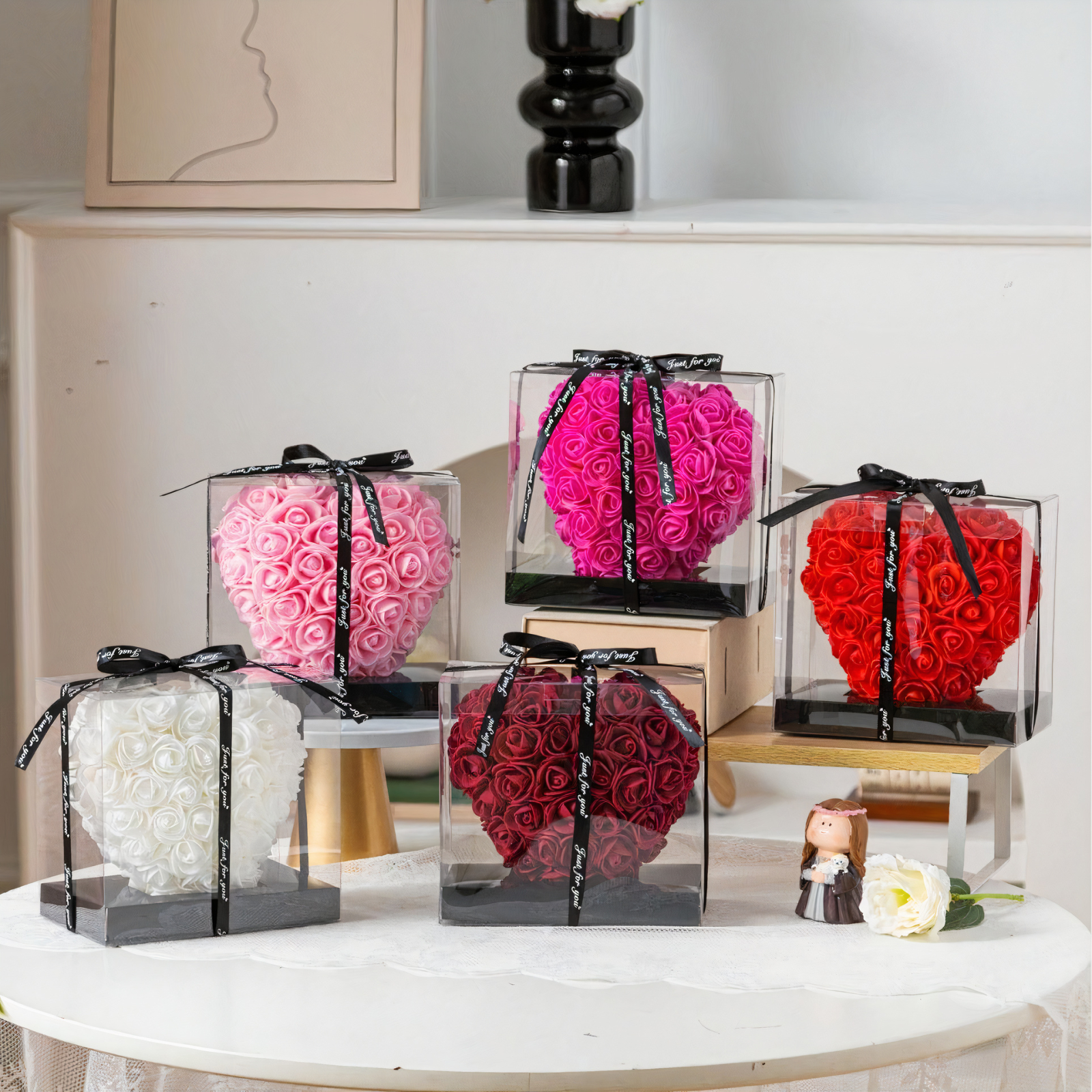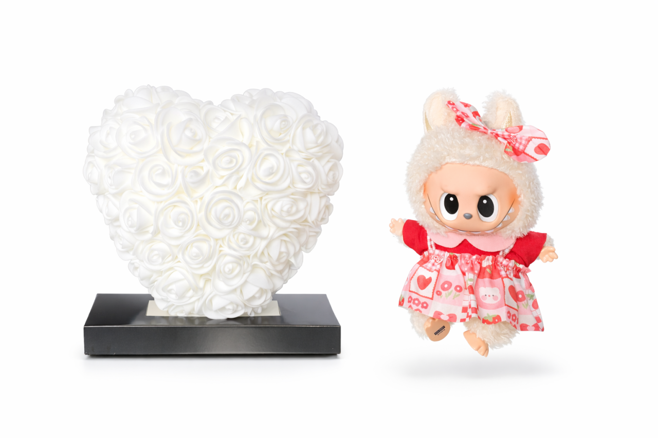Cadou Labubu si Inima din Trandafiri 15x15cm cu Flori de Spuma, in Cutie Transparenta 15cm - alb
