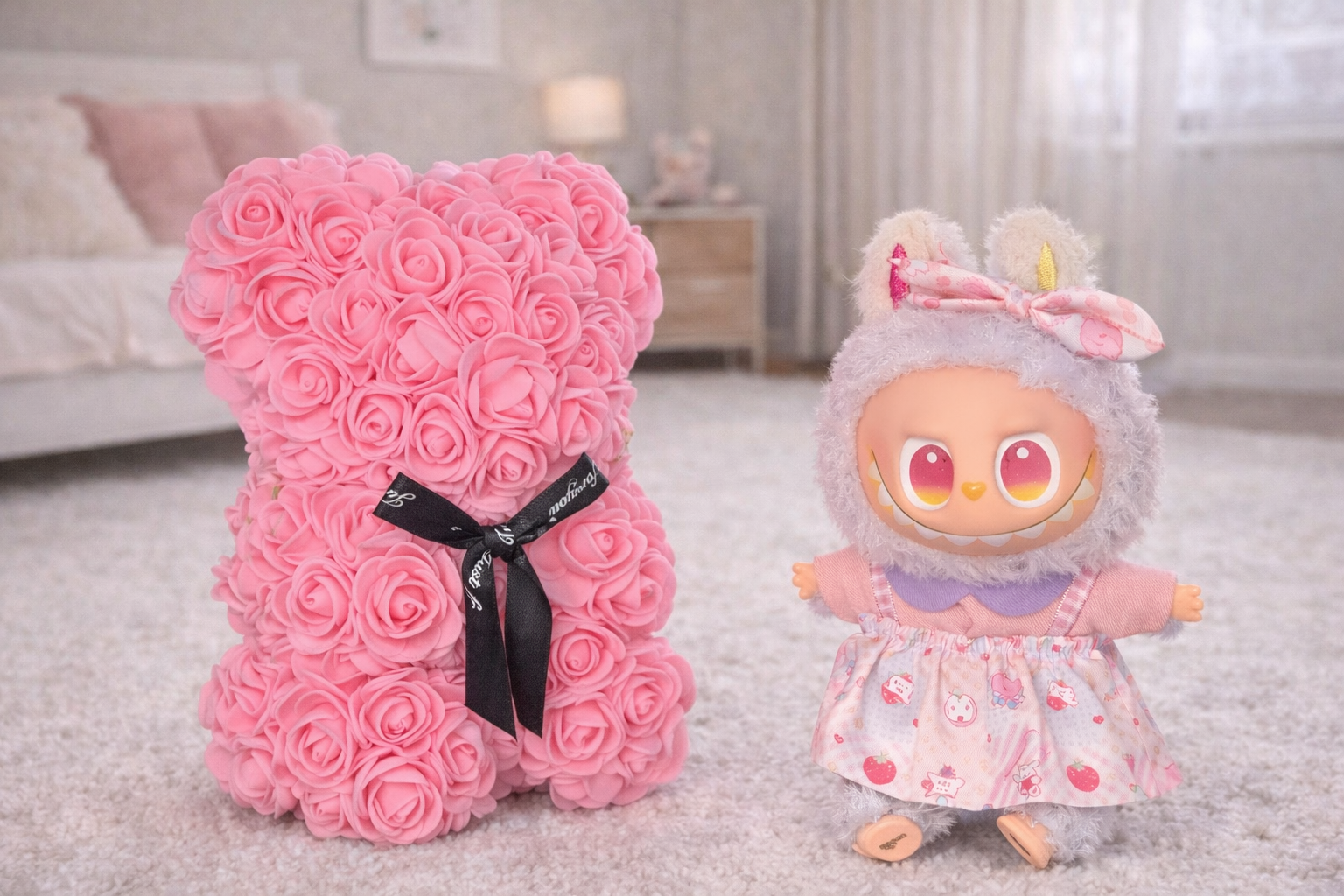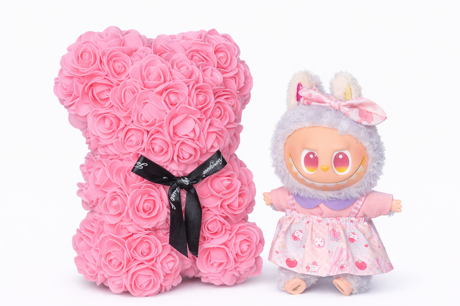 Cadou Labubu si Ursulet din Trandafiri 25cm cu Flori de Spuma, in Cutie Transparenta 30x17cm - roz