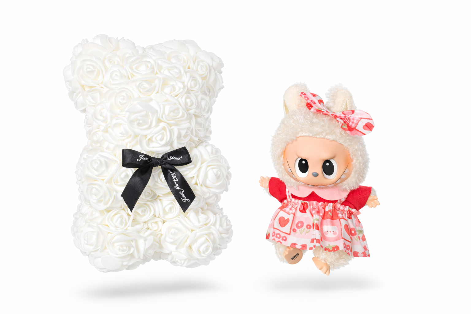 Cadou Labubu si Ursulet din Trandafiri 25cm cu Flori de Spuma, in Cutie Transparenta 30x17cm - alb