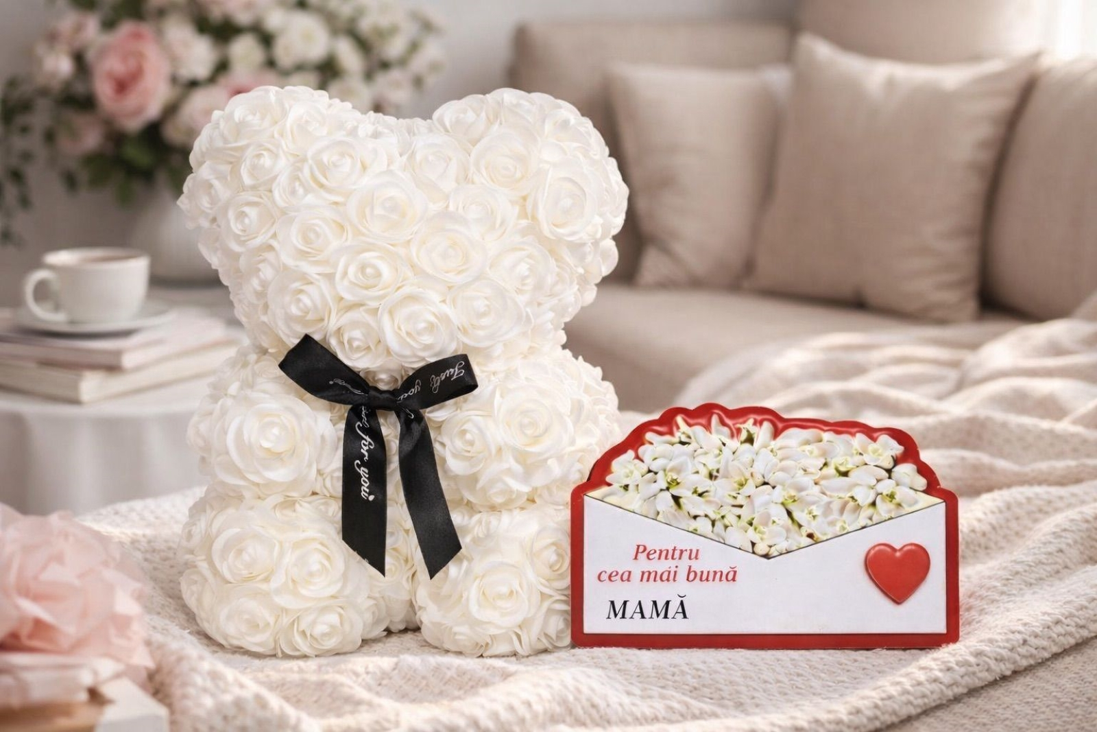 Ursulet din Trandafiri 25cm cu Flori de Spuma, in Cutie Transparenta 30x17cm - alb si magnet cea mai buna mama.