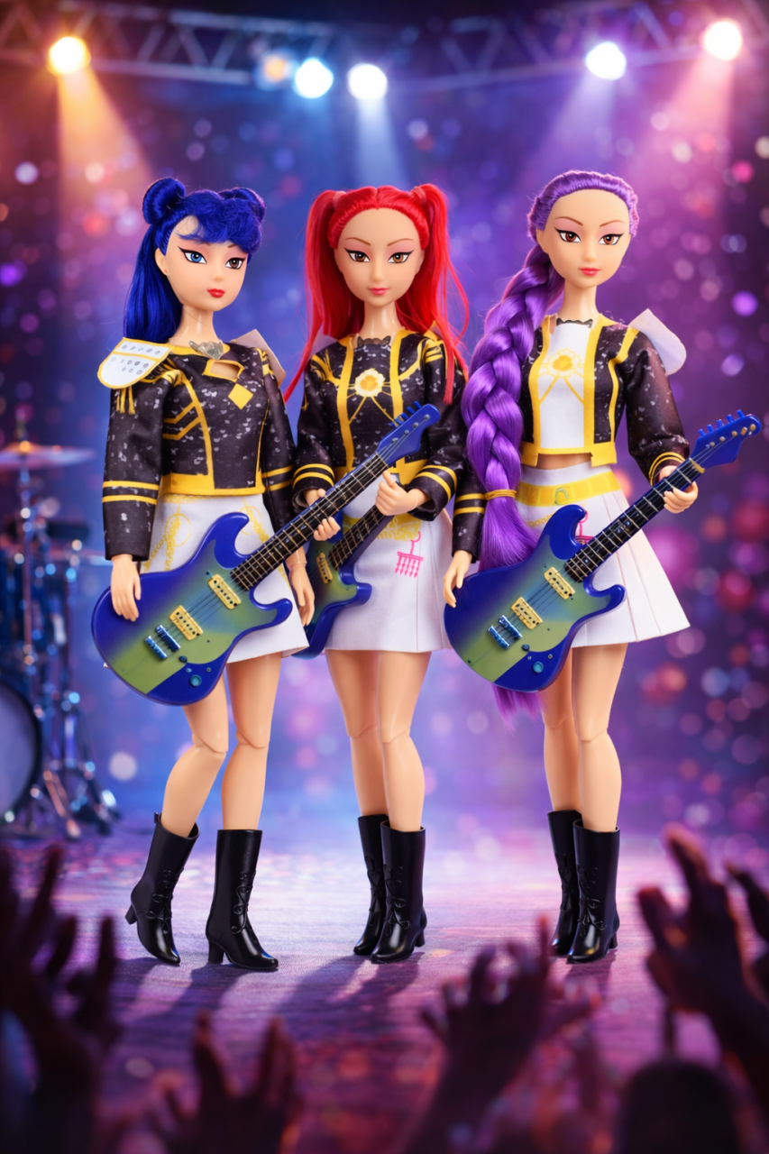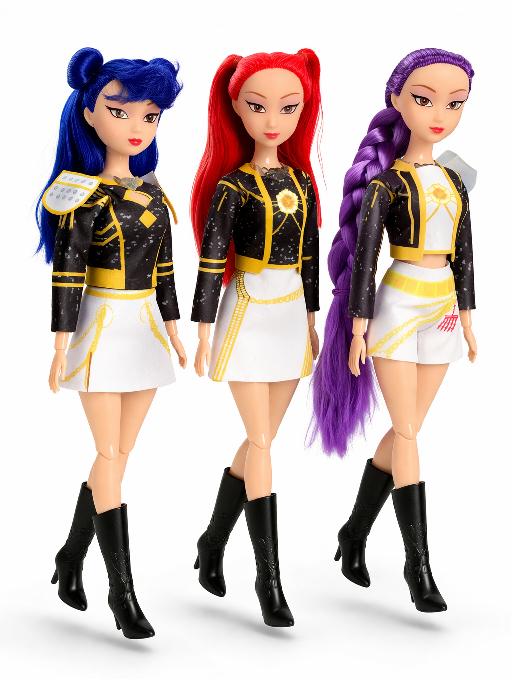 Set 3 Papusi Muzicale 32 cm Kpop Demon Hunters / K-pop Demon Hunters - Vanatorii de demoni  - alb cu auriu si negru